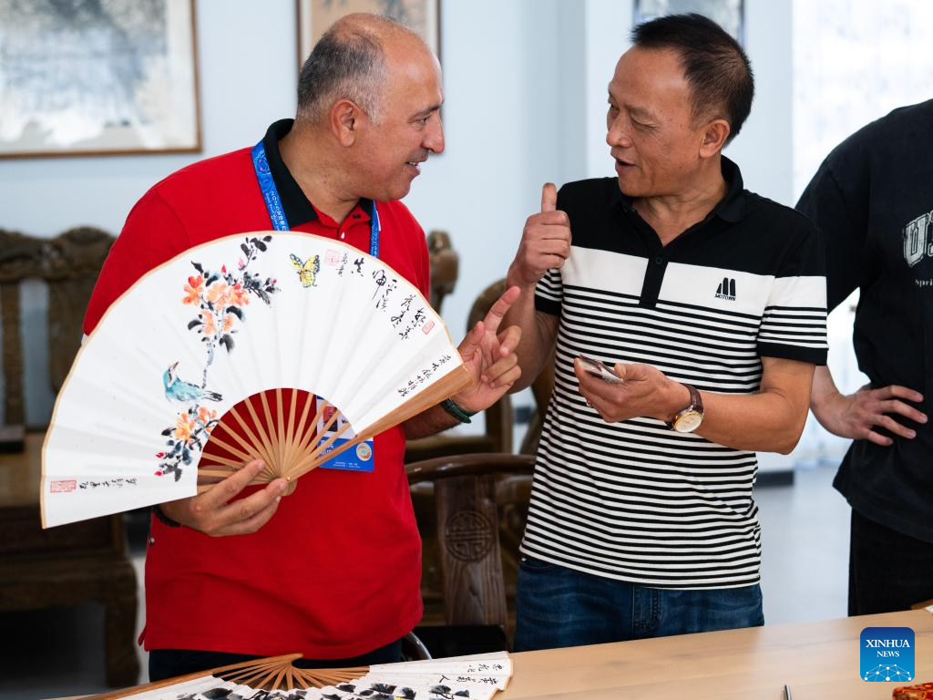 A guest (L) to the 2025 Global South Media and Think Tank Forum learns about fan painting in Mengzi City of Honghe Hani and Yi Autonomous Prefecture, southwest China's Yunnan Province, Sept. 8, 2025.