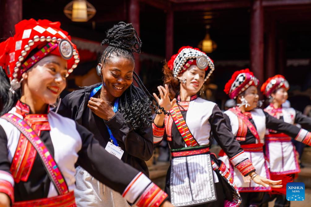 A guest (2nd L) to the 2025 Global South Media and Think Tank Forum dances with locals in Mile City of Honghe Hani and Yi Autonomous Prefecture, southwest China's Yunnan Province, Sept. 8, 2025.