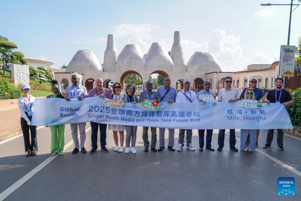 Guests to the 2025 Global South Media and Think Tank Forum pose for a group photo in Mile City of Honghe Hani and Yi Autonomous Prefecture, southwest China's Yunnan Province, Sept. 8, 2025.
