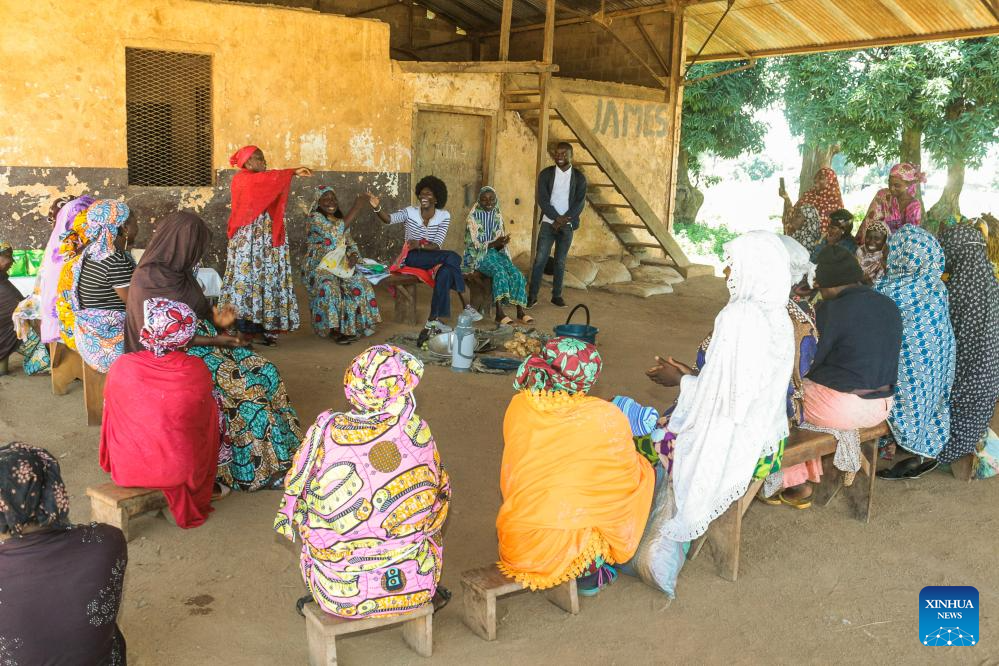 Rachel Yaoudam (C, striped shirt) speaks during a training session with members of her organization in Ngaoundere, Adamawa Region, Cameroon, on Oct. 7, 2025. (Xinhua/Kepseu)