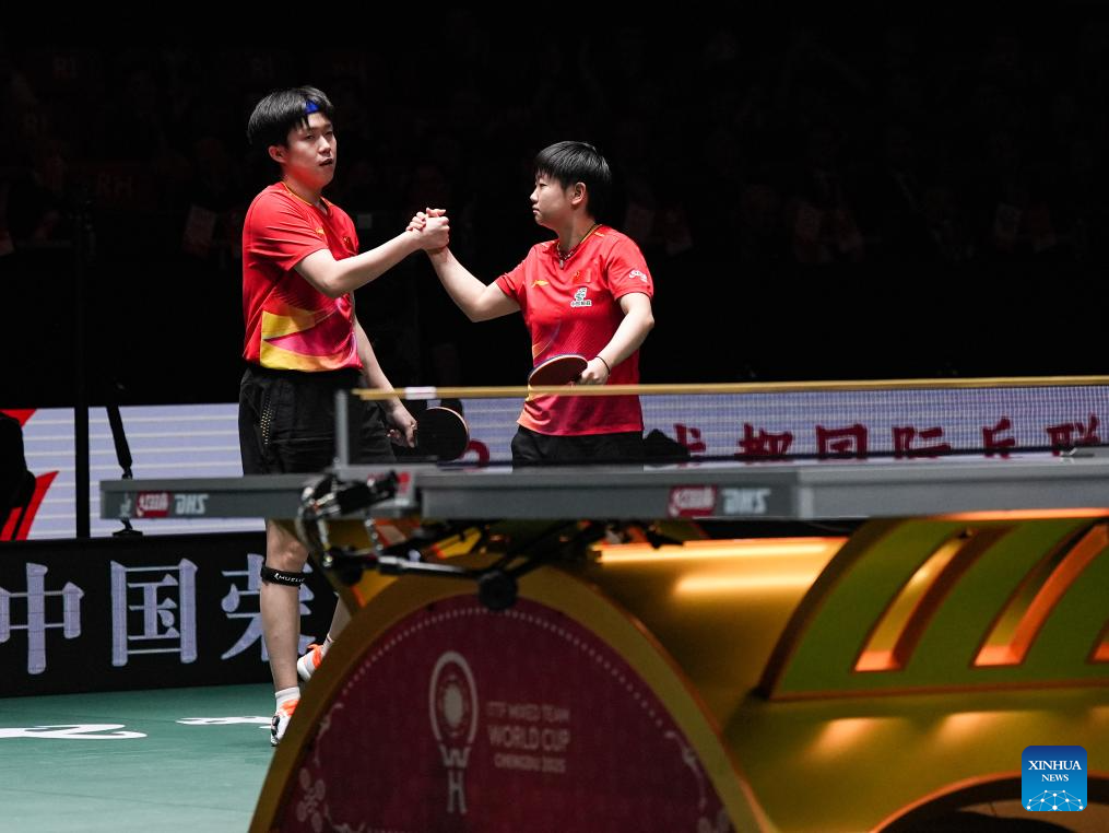 Wang Chuqin/Sun Yingsha (R) of China celebrate in the mixed doubles match against Matsushima Sora/Odo Satsuki of Japan during the final match between China and Japan at the ITTF Mixed Team World Cup 2025 in Chengdu, southwest China's Sichuan Province, Dec. 7, 2025. (Xinhua/Wang Xi)