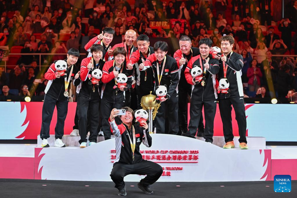Gold medalists team China pose for a selfie during the awarding ceremony at the ITTF Mixed Team World Cup 2025 in Chengdu, southwest China's Sichuan Province, Dec. 7, 2025. (Xinhua/Wang Ying)