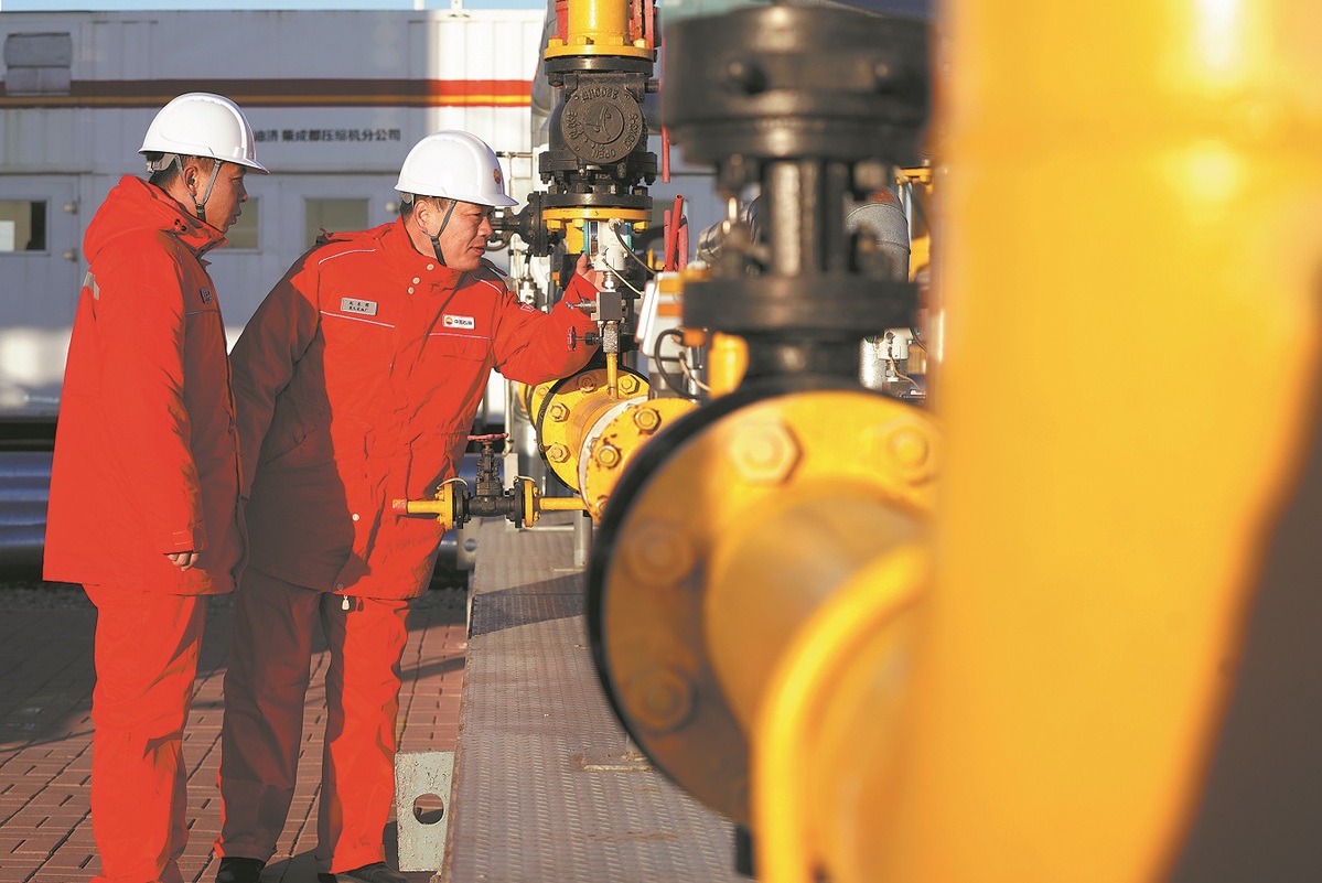 Operators conduct inspections and maintenance on equipment at Daqing Gulong continental shale oil national demonstration zone in Heilongjiang province on Thursday. WANG SONG/XINHUA