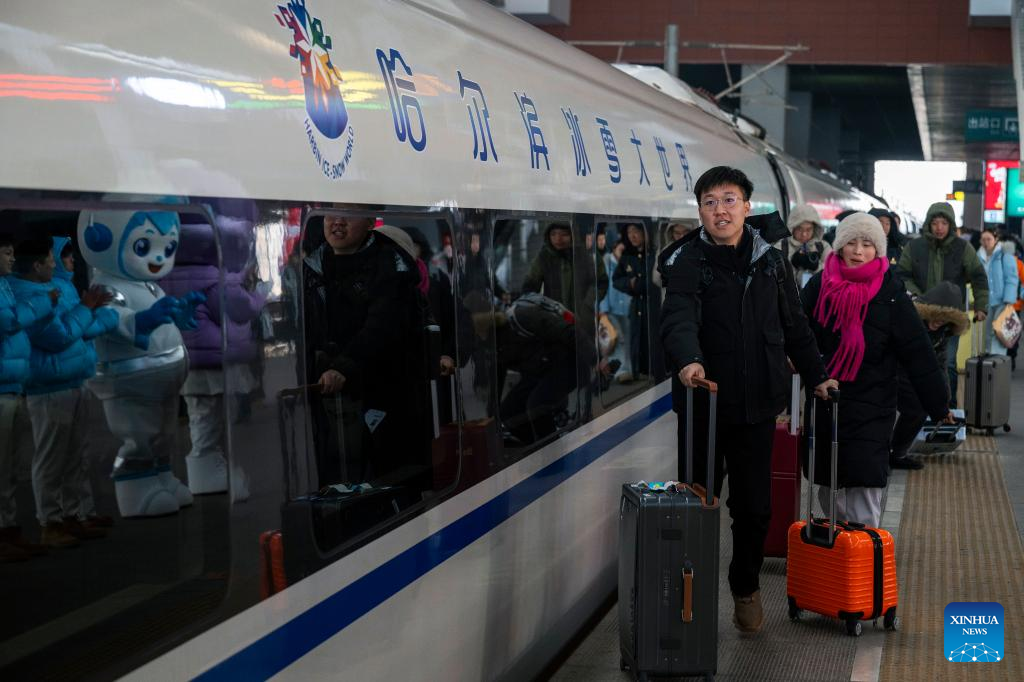Passengers prepare to board the bullet train No.G1276, the first themed high-speed train of the Harbin Ice-Snow World, at Harbin West Station in Harbin, northeast China's Heilongjiang Province, Jan. 4, 2026. The first high-speed train with the theme of the Harbin Ice-Snow World began service from Harbin West Station on Sunday, heading for Wuhan City in central China's Hubei Province. Featuring unique interior and exterior decorations of the Harbin Ice-Snow World, the themed high-speed train serves as a mobile emblem to boost the ice and snow economy. (Xinhua/Zhang Tao)