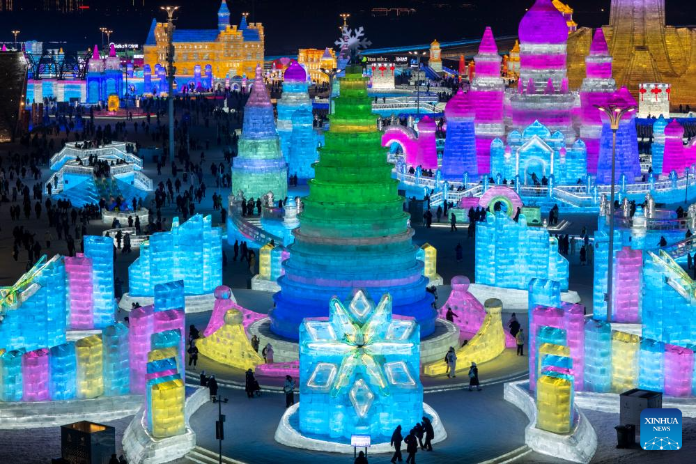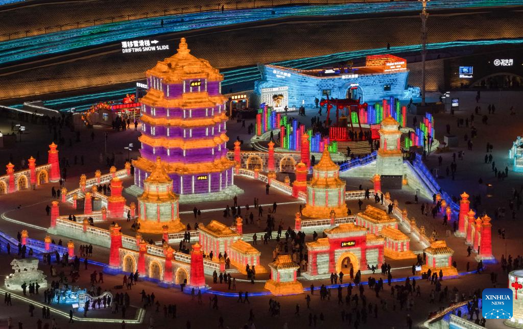An aerial drone photo taken on Jan. 5, 2026 shows a view of the Harbin Ice-Snow World in Harbin, northeast China's Heilongjiang Province. The 42nd Harbin International Ice and Snow Festival kicked off at the Harbin Ice-Snow World here on Monday. (Xinhua/Zhang Tao)