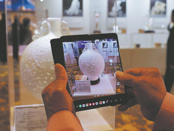 A visitor takes a photo of a Dehua porcelain vase in an exhibition in Los Angeles. [Photo provided to China Daily]