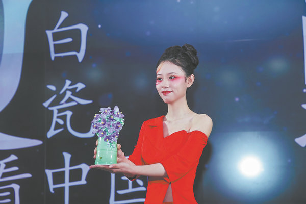 A flower-themed piece on show at the recent launch ceremony for a Dehua porcelain international cultural exchange in Beijing. [Photo provided to China Daily]