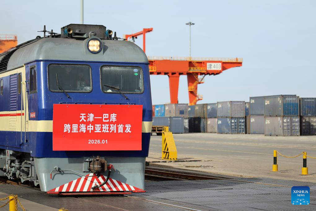 This photo taken on Jan. 19, 2026 shows the first cross-Caspian Sea China-Central Asia freight train departing from north China's Tianjin Municipality. The first cross-Caspian Sea China-Central Asia freight train from Tianjin to Baku, Azerbaijan, departed on Monday, carrying goods such as stainless steel pipes and household appliances. The train, operated by China Railway Beijing Group, will leave the country via Horgos Port in northwest China's Xinjiang Uygur Autonomous Region before traversing Kazakhstan and ultimately being shipped across the Caspian Sea to Baku. (Xinhua/Li Ran)