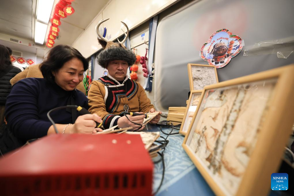 A tourist from Malaysia (L) experiences painting techniques of Elunchun nationality on K7041, a train themed on folk culture of northeast China, in northeast China's Heilongjiang Province, Jan. 19, 2026. Recently, tourists from Southeast Asian countries have been flocking to Harbin, hailed as China's "Ice City," with unprecedented enthusiasm. (Photo by Xu Shuai/Xinhua)