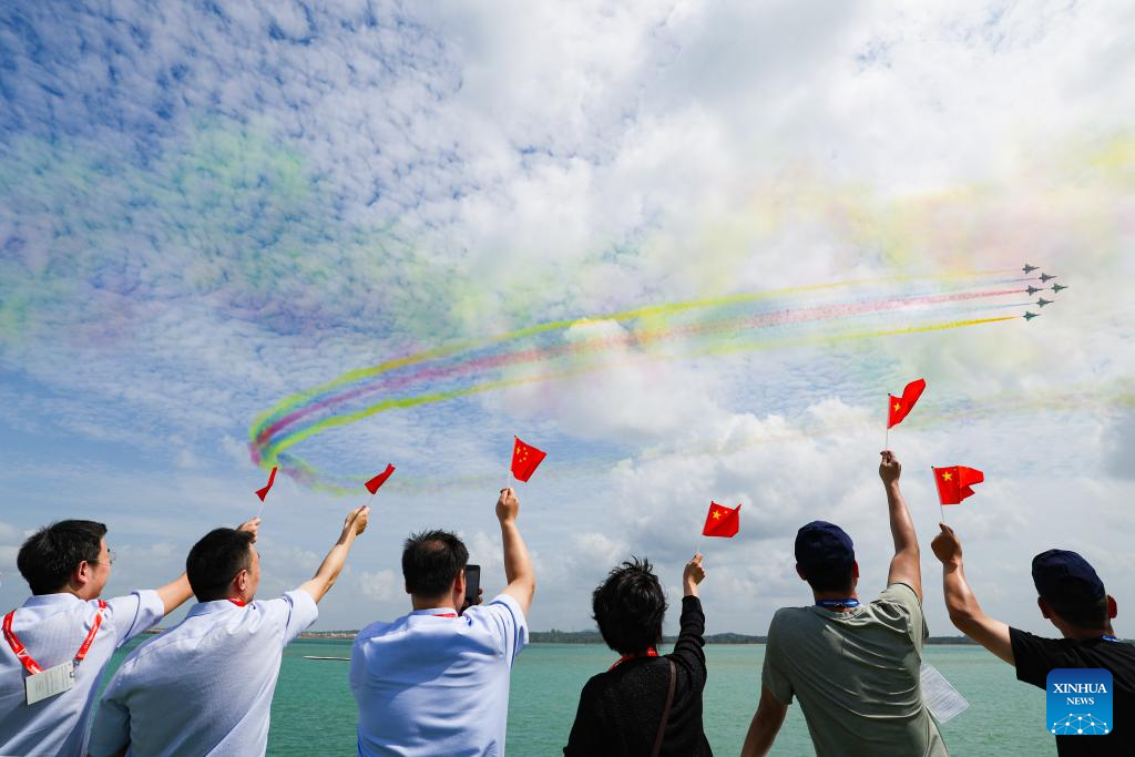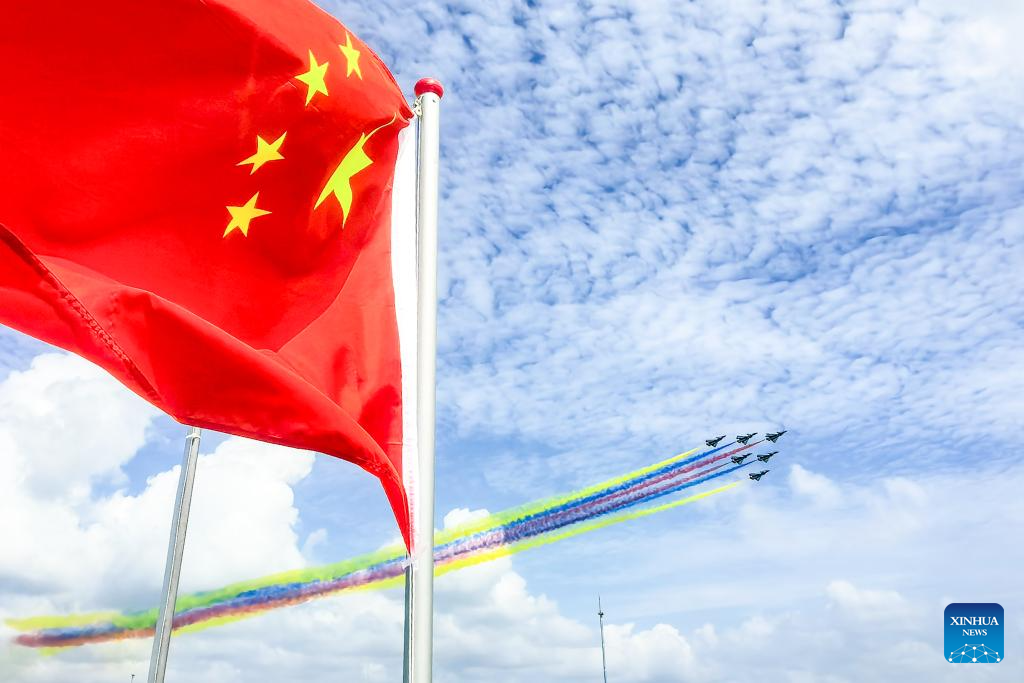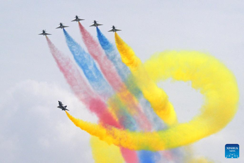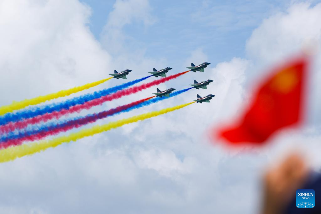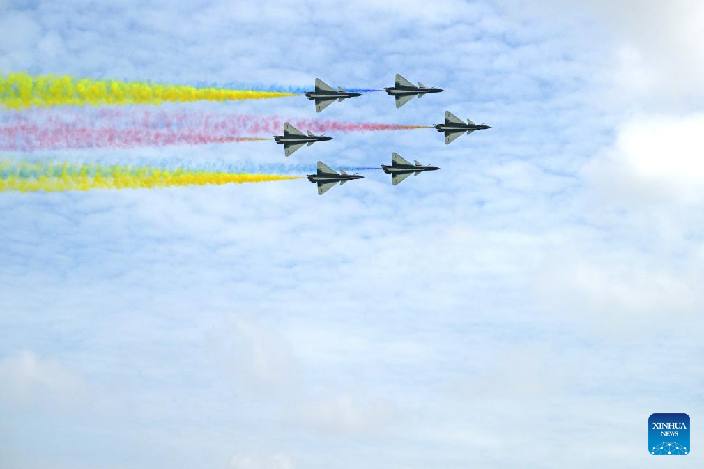Aircraft of the Bayi Aerobatic Team of the Chinese People's Liberation Army (PLA) Air Force perform during the 10th Singapore Airshow in Singapore, Feb. 4, 2026. The 10th Singapore Airshow opened on Tuesday at the Changi Exhibition Center. The airshow runs until Feb. 8, with the Bayi Aerobatic Team of the Chinese People's Liberation Army (PLA) Air Force delivering flight displays. (Photo by Zhu Jianghai/Xinhua)