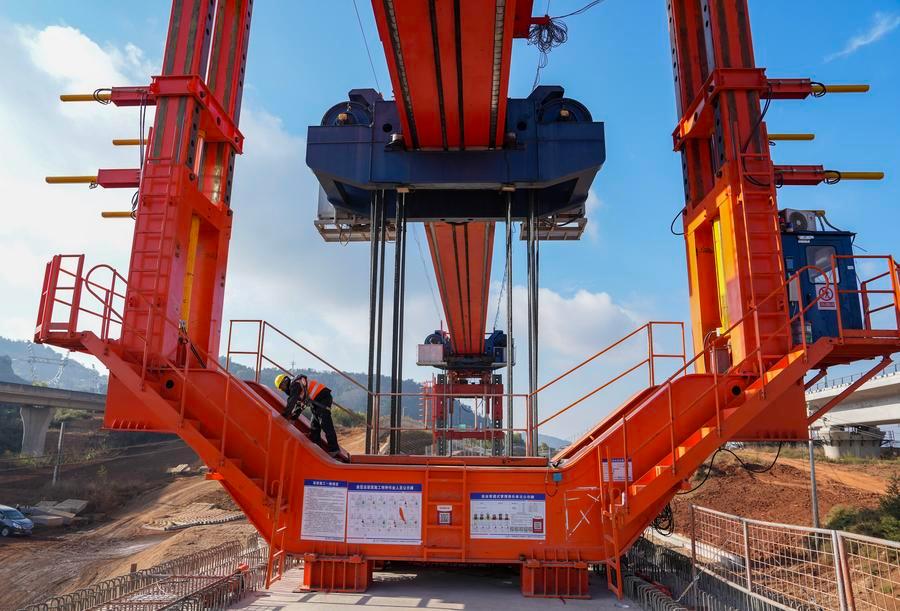 A staff member works to position the last box girder of a bridge along the Chongqing-Kunming high-speed railway in Chenggong District of Kunming, southwest China's Yunnan Province, Feb. 3, 2026. (Xinhua/Chen Xinbo)