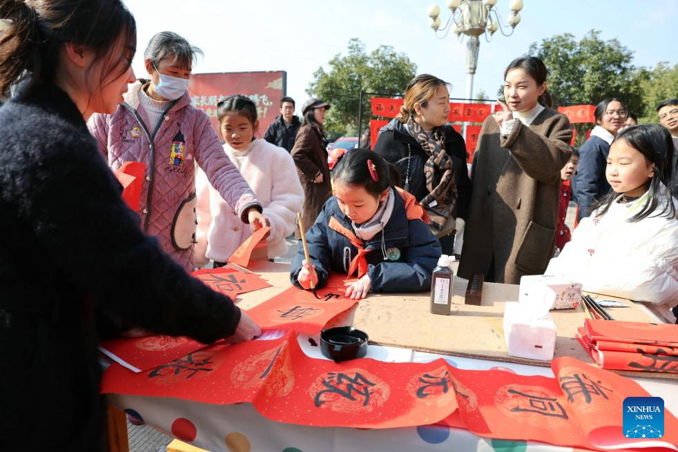 Students write spring couplets at a primary school in Dongyang, east China's Zhejiang Province, on Feb. 8, 2026. Various extracurricular activities are available for students across China during the winter vacation. (Photo by Bao Kangxuan/Xinhua)