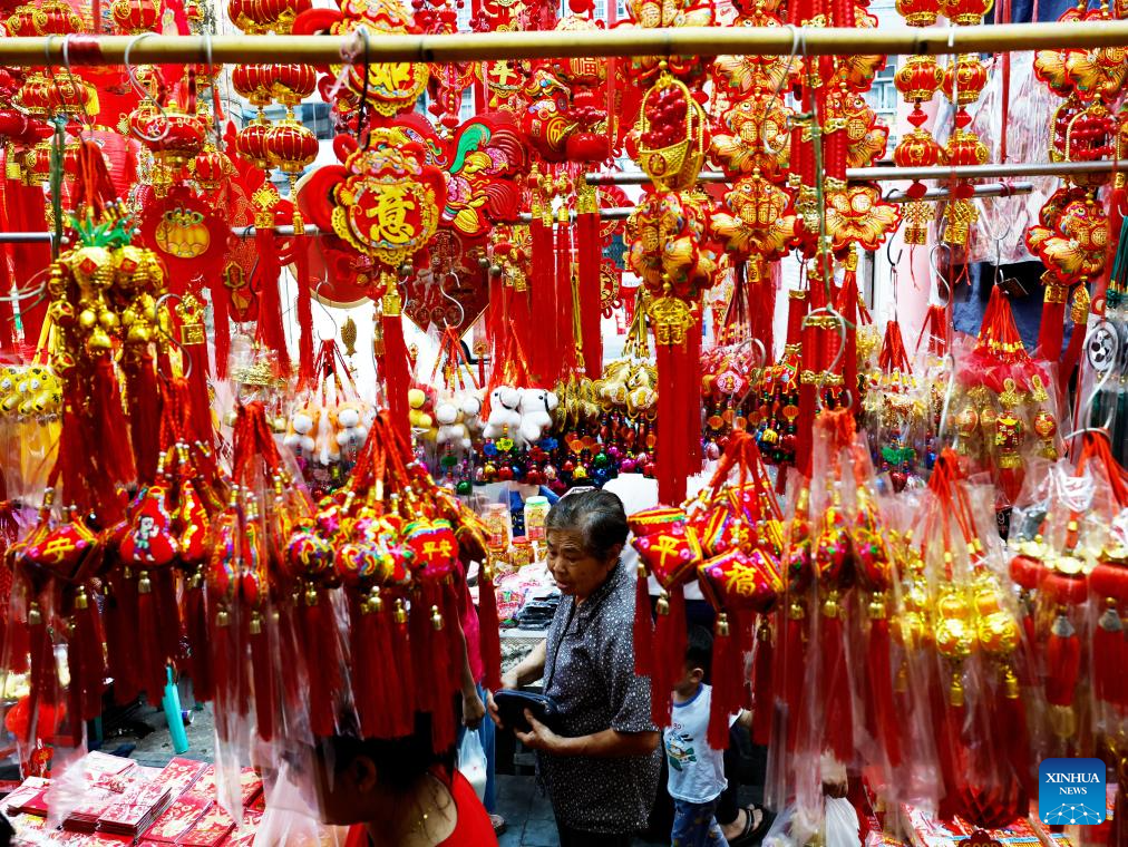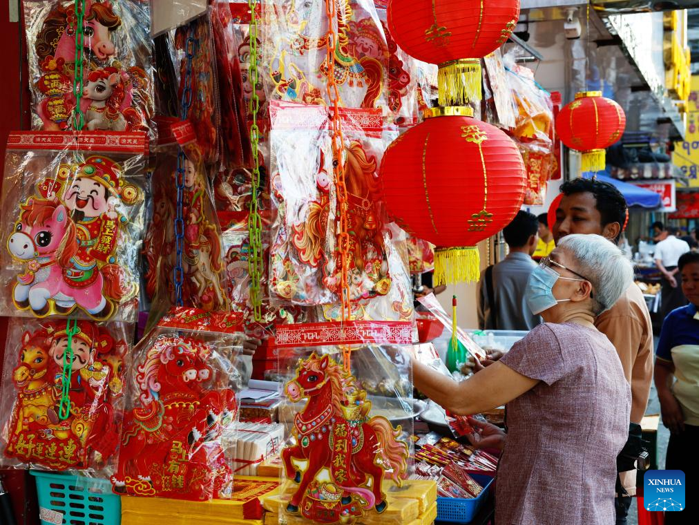 A customer selects decorations for the upcoming Chinese New Year at a shop in Chinatown of Yangon, Myanmar, Feb. 11, 2026. (Xinhua/Myo Kyaw Soe)