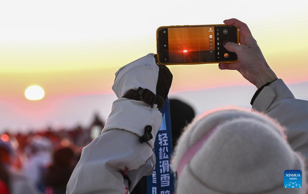 A ski enthusiast takes photos of sunset at the Jiangjunshan International Ski Resort in Altay Prefecture, northwest China's Xinjiang Uygur Autonomous Region, Feb. 25, 2026. Following the Spring Festival holiday, major ski resorts in Altay continue to witness strong popularity and steady visitor flows. The Jiangjunshan International Ski Resort has welcomed an average of 12,800 visitors on a daily basis after the holiday, around 8,700 of whom would enjoy skiing here. (Xinhua/Wang Fei)