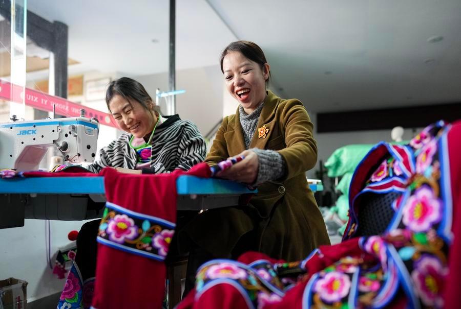 Jin Ruirui checks a piece of Yi ethnic costume featuring handmade embroidery at her studio in Mouding County, southwest China's Yunnan Province, Feb. 9, 2026. (Xinhua/Chen Xinbo)