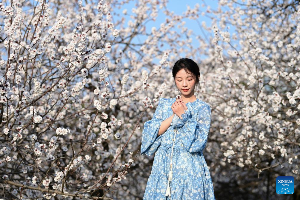 A tourist poses for photos with blooming trees at the Daming Palace National Heritage Park, in Xi'an, northwest China's Shaanxi Province, March 9, 2026. Flowers bloom as temperature rises in China. (Xinhua/Zou Jingyi)