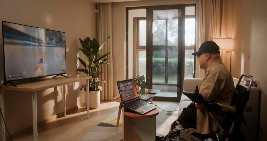 A man plays a racing game with a brain-computer interface (BCI) device at his residence in east China's Shanghai, on April 30, 2025. (Photo by Dai Yanmiao/Xinhua)