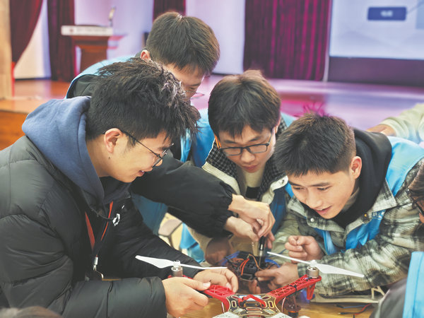 Thai students try their hand at drone assembly at Guizhou Industry Polytechnic College on Feb 5, 2026. [Photo provided to China Daily]