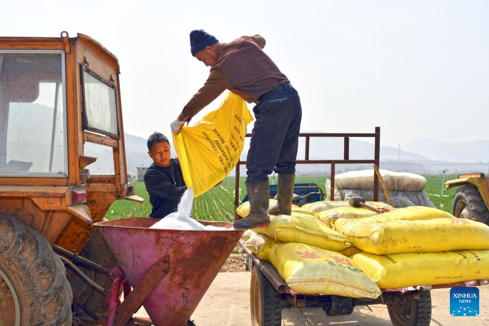 Farmers prepare to fertilize wheat in Gaotuan Town of Fushan District, Yantai City, east China's Shandong Province, March 23, 2026. After the Spring Equinox, farmers across Shandong seize the farming season to carry out spring plowing. (Photo by Sun Wentan/Xinhua)