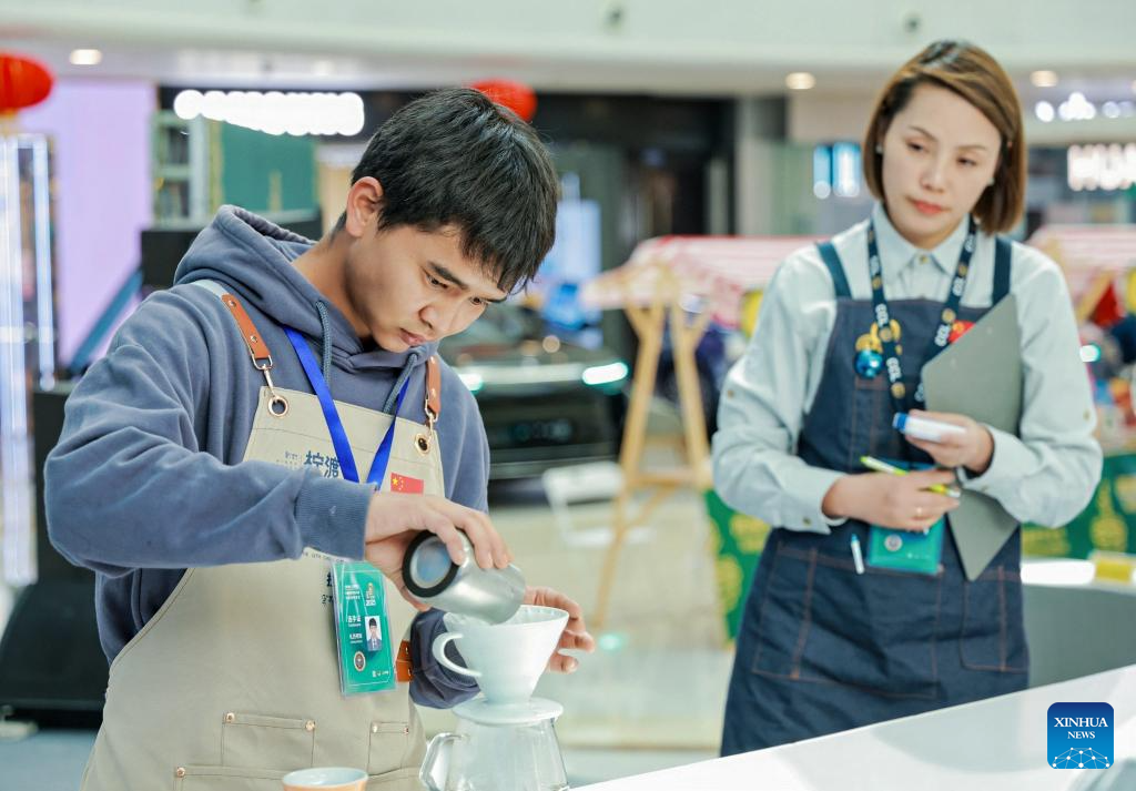 A barista (L) of Nindo coffee attends a coffee brewers competition in Lhasa, southwest China's Xizang Autonomous Region, Oct. 12, 2025. (Xinhua/Purbu Tsering)