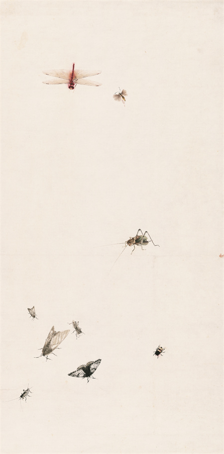 Qi preferred mineral pigments and colors such as green and cinnabar, with which he recreated the sense of weight and density of beetles' hardened, shell-like forewings. His masterful variations in brush pressure produced long, smooth lines to depict the suppleness and vitality of katydids.