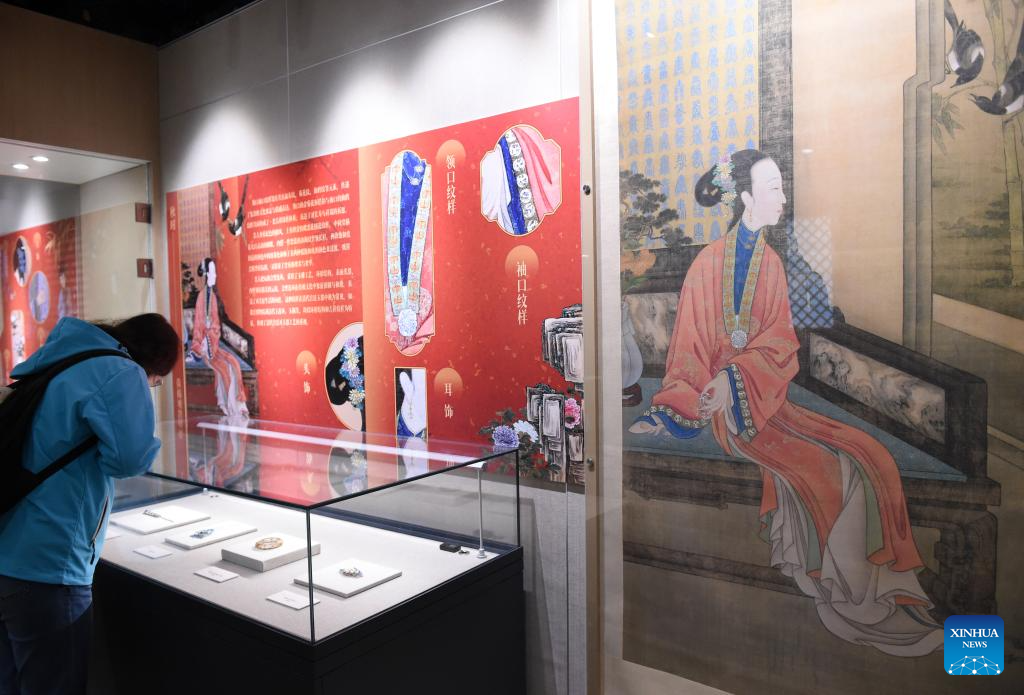 Jin Xin introduces one of her artwork displayed at an exhibition hall of Beijing Embroidery in Beijing, capital of China, Nov. 26, 2024.