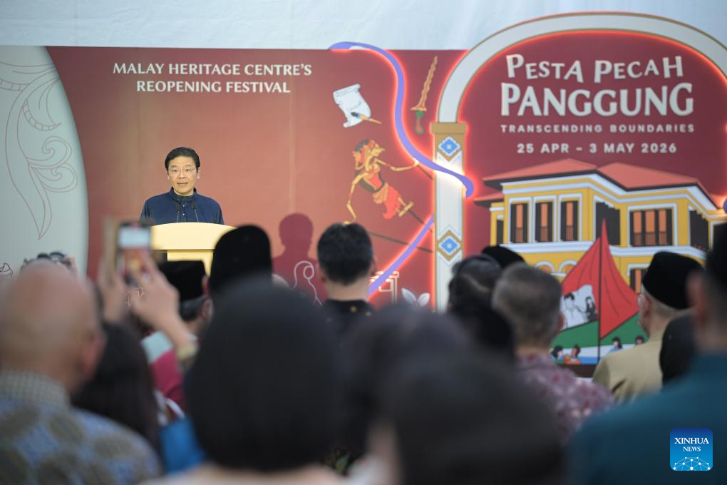 Singaporean Prime Minister Lawrence Wong delivers a speech during the reopening ceremony of the Malay Heritage Centre in Singapore's Kampong Gelam on April 25, 2026.