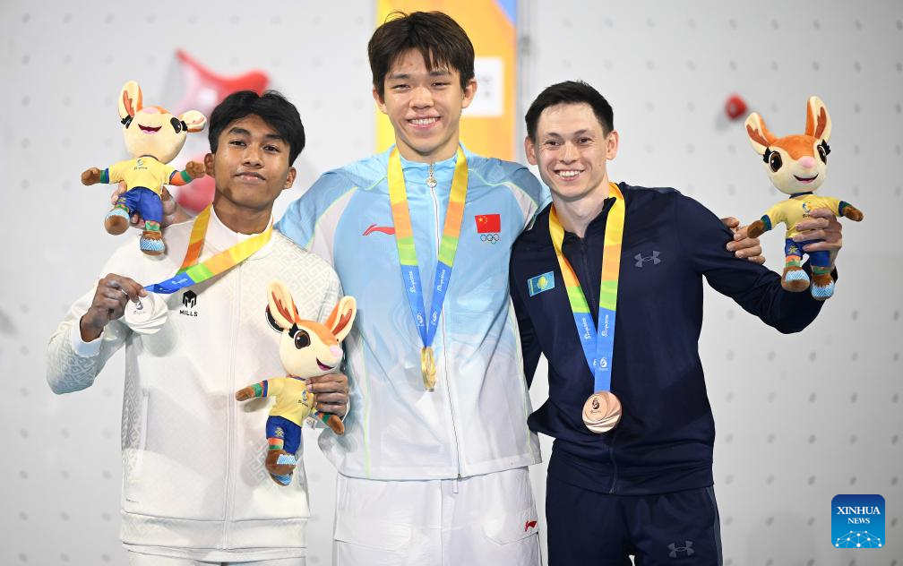 Gold medalist Zhao Yicheng (C) of China, silver medalist Antasyafi Robby Al Hilmi (L) of Indonesia and bronze medalist Rishat Khaibullin of Kazakhstan pose during the awarding ceremony after the sport climbing (speed) men's individual final at the 6th Asian Beach Games in Sanya, south China's Hainan Province, April 28, 2026. (Xinhua/Zhao Zishuo)