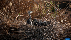 Baby herons are seen at Shahu scenic area in Pingluo County of Shizuishan City in northwest China's Ningxia Hui Autonomous Region, April 18, 2026.