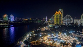An aerial drone photo taken on Dec. 17, 2024 shows a giant snowman in Harbin, northeast China's Heilongjiang Province.