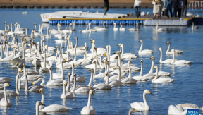 Wintering whooper swans are pictured in a lake in Rongcheng, east China's Shandong Province, Jan. 5, 2026.