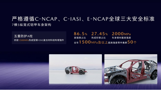 卓越的碰撞成绩来自于车身结构的创新。EZ-60采用7横5纵的笼式铠甲结构,高强钢占比86.5%,热成形钢27.45%,最高强度2000MPa,全车1500MPa及以上超高强度零件集群50个,关键部位更是层层加码,如A柱采用五重防护结构,内外双层1500MPa热成型钢和腔体SNS复合材料,大幅增强A柱的钣金强度和刚度,抗弯性能提升44%。