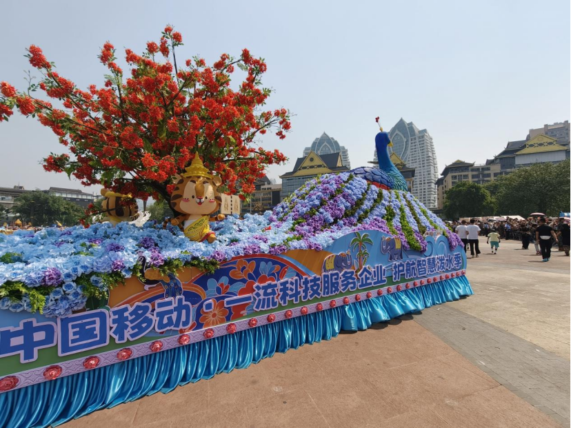要说泼水节最具视觉冲击力的环节,非民族民间文化大游演莫属。傣族、布朗族、哈尼族等各民族方队盛装起舞,尽显版纳多民族风情。一辆辆花车紧随其后缓缓穿行,沿街播撒祝福。其中,中国移动云南公司(以下简称:云南移动)孔雀花车格外亮眼,蓝孔雀傲立车头,凤凰花树热烈盛放, IP形象“豹豹”惬意窝在花荫下,车前三台机器人随鼓点起舞,吸引了不少人打卡拍照。