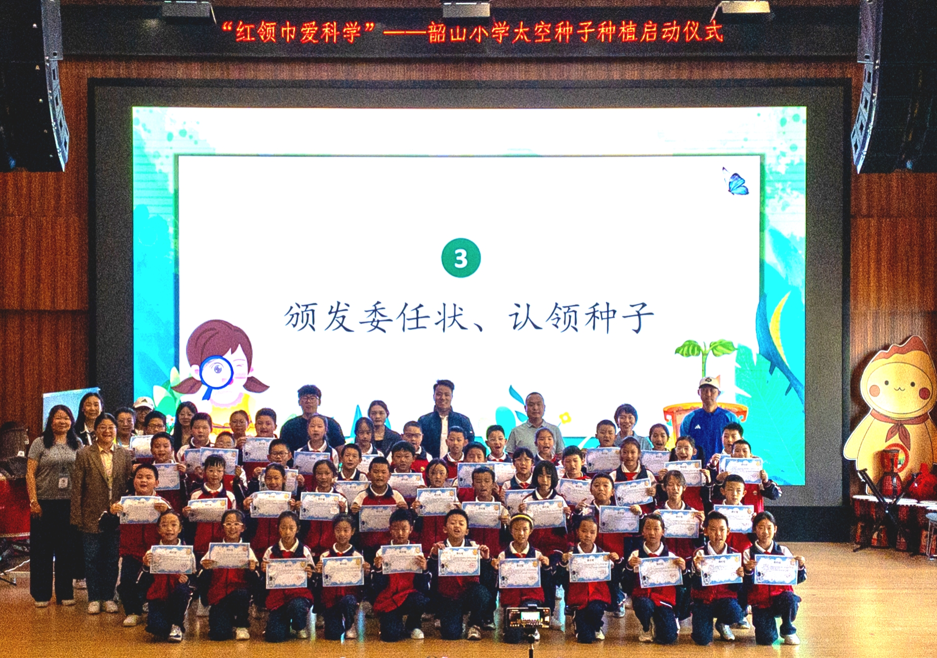 昆明信息港讯 记者张薇 4月17日,昆明市五华区韶山小学三个校区同步举行了一场特别的“委任仪式”。 作为该活动主会场的韶山小学西校区的近2000名同学共同参与仪式,一起见证了百名同学正式获聘为“太空种子培育官”。