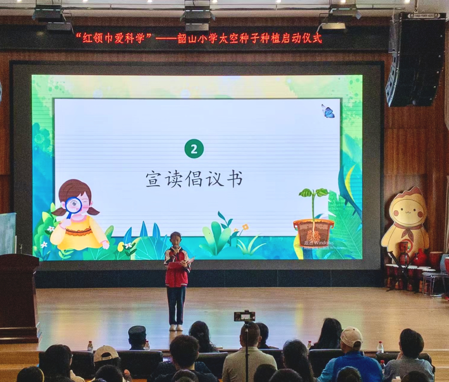 当天上午大课间,委任仪式在三个校区同步进行。西校区的队员代表宣读倡议书,介绍太空种子是科学家将普通种子送上太空,让它们在宇宙特殊环境中“锻炼”后带回地球后,可能长得更高、结的果实更大,甚至产生意想不到的变化。活动鼓励同学们从播种到发芽、开花、结果,全程亲手照顾小生命,探索宇宙对植物生长的影响,体会劳动的快乐,培养责任意识。