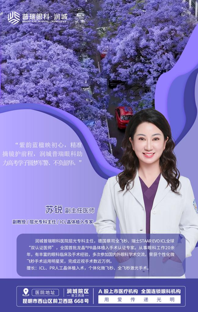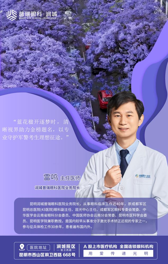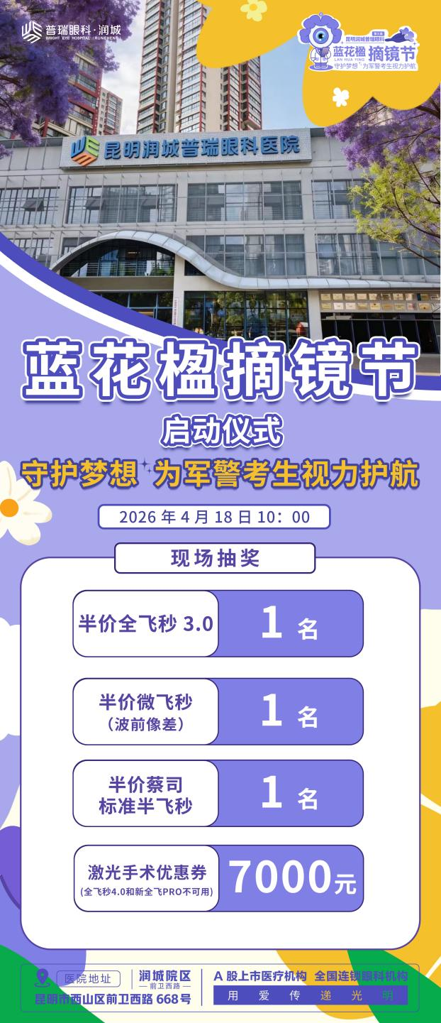 4月18日(周六)上午10点,将在润城普瑞眼科医院开展“第三届蓝花楹摘镜节”启动仪式,届时润城普瑞眼科医院近视手术主刀医生雷鸣院长、苏锐主任将与广大摘镜青年及考生家长见面,详解近视手术原理。