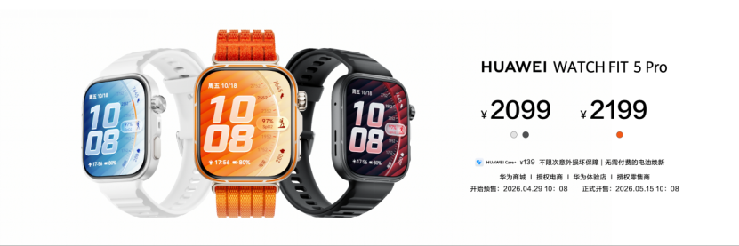 HUAWEI WATCH FIT 5现已开启预售,4月29日全渠道正式开售,售价1099元起,国补后到手价935元起。HUAWEI WATCH FIT 5 Pro将于4月29日开启预售,5月15日全渠道正式开售,售价2099元起,国补后到手价1785元起。用户可登陆华为商城及各大授权电商平台,或前往华为体验店、华为授权零售门店进行购买。(昆明信息港)
