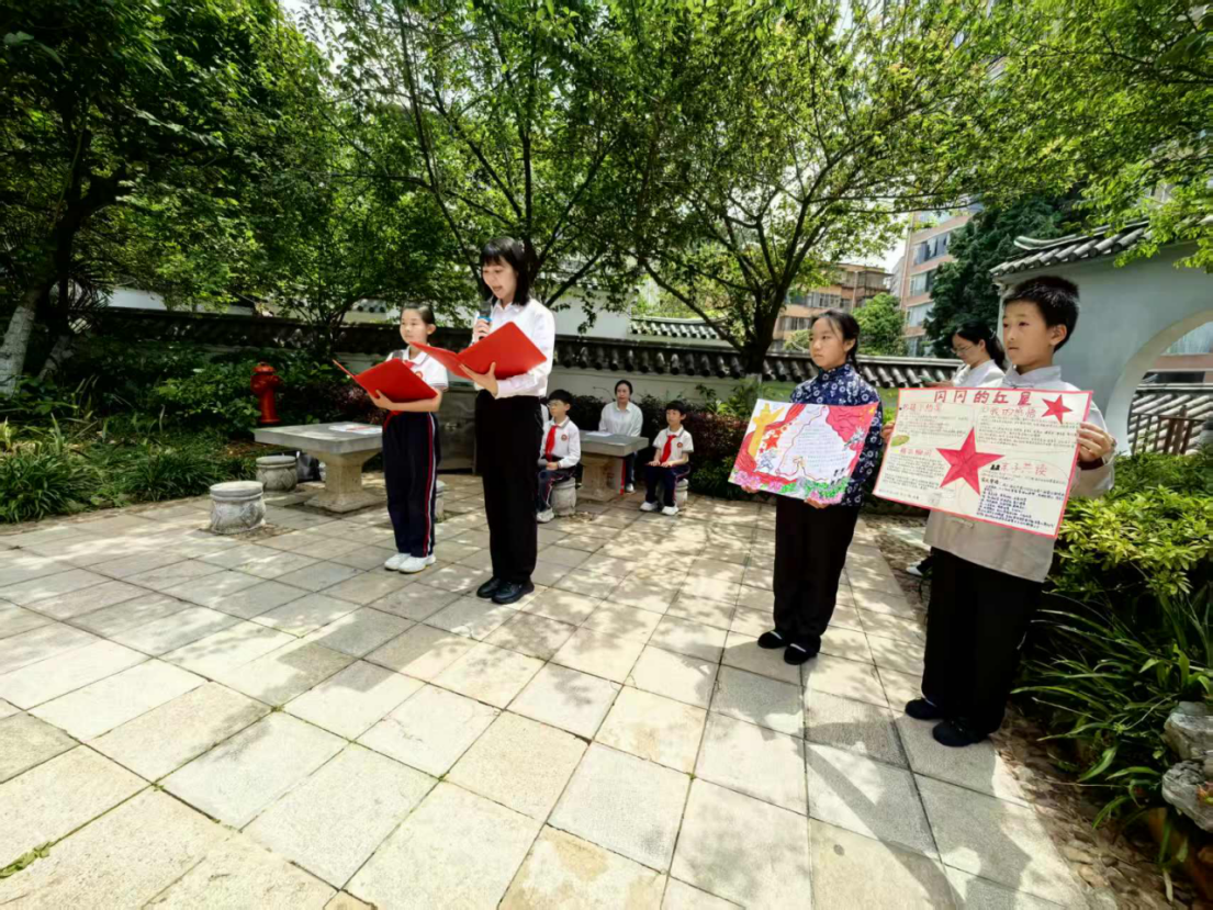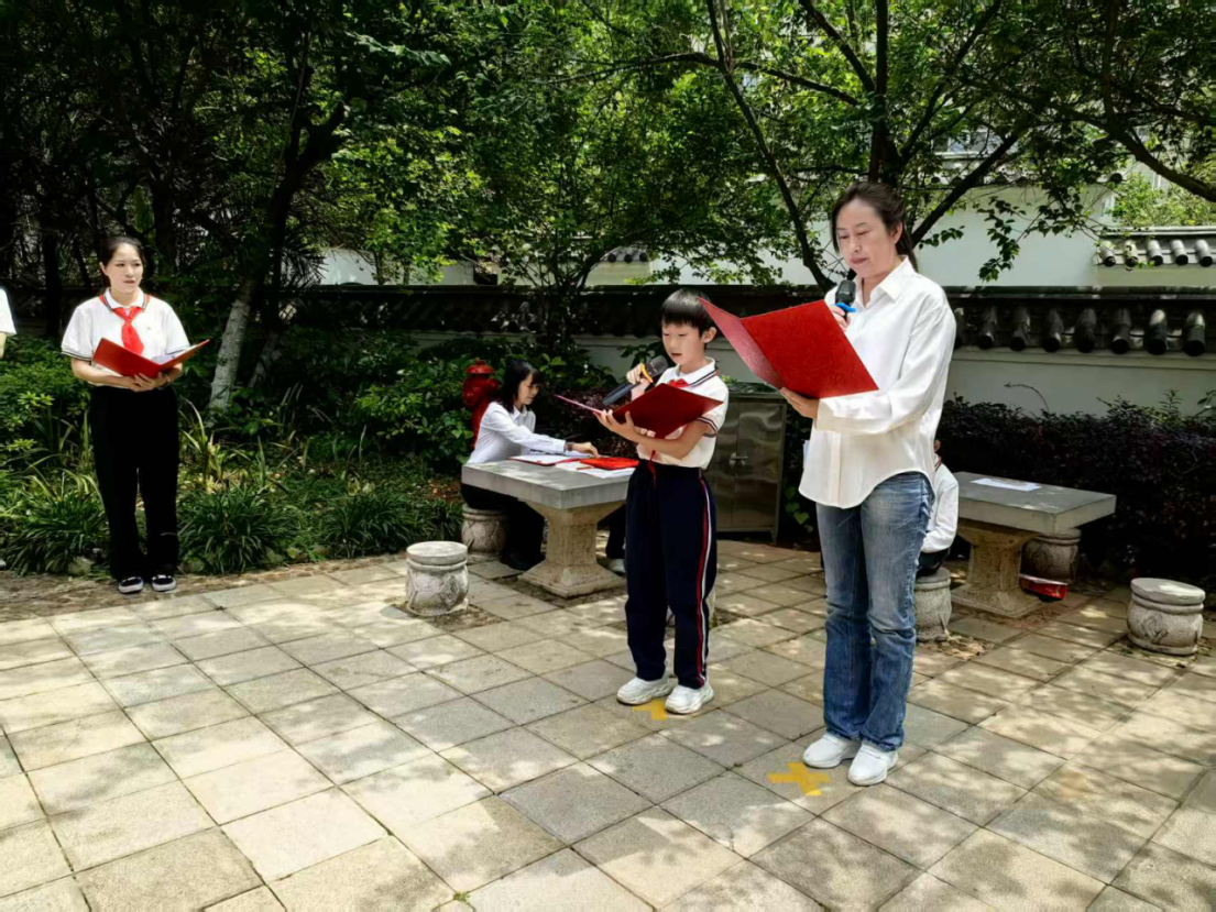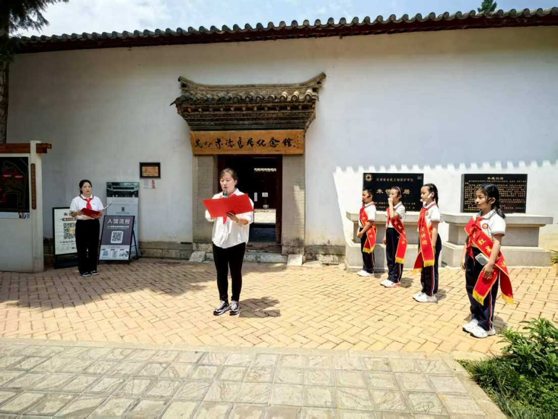 诵读环节更是将活动气氛推向高潮。第一组少先队员带来《家书里的光》,用清澈的童声诵读朱德家书中的经典段落,传递信仰的力量;第二组队员朗诵《小小红领巾》和《隔壁的朱德爷爷》,稚嫩的声音中透着坚定,鲜艳的红领巾映照着少年们认真的脸庞。活动最后,全体少先队员齐声朗诵《朱德颂》,整齐有力的声音在纪念馆庭院中回荡,表达着对朱德爷爷的深深敬意。