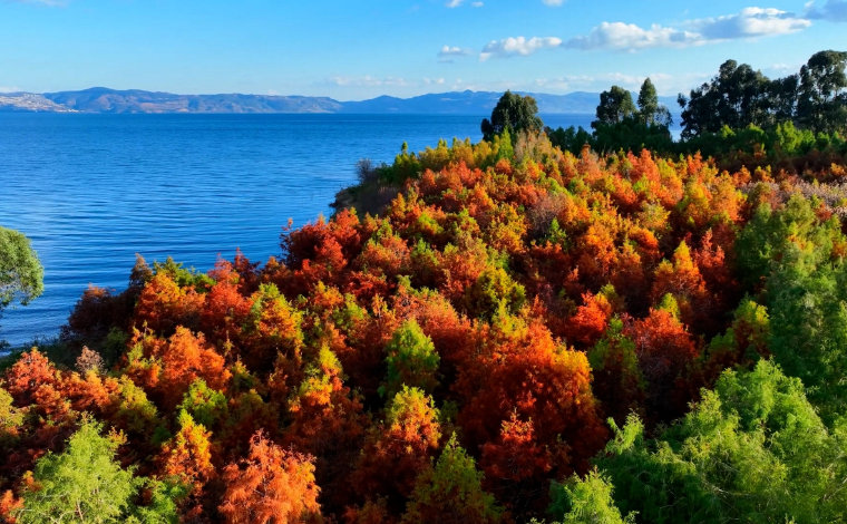 冬日抚仙湖:红杉灼灼 碧水悠悠