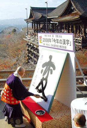 台媒体报道,本月12日是日本的“汉字之日”,日本汉字能力鉴定协会举行反映今年世间事的票选活动,结果选出“变”字,下午由京都清水寺的住持在大大的和纸上挥毫写出此字。