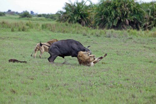2009年1月18日,在南非博茨瓦纳,摄影师Lee Whittam拍到狮子和非洲野牛大战的精彩场面。当时,一头狮子扑到了一头非洲小野牛,正当它准备开始享用美餐时,大野牛突然冲向狮子去解救它的孩子,在经过大约15分钟的搏斗后,小野牛最终还是不幸死亡,大野牛虽然没有成功解救孩子,但是却展示了伟大的爱。