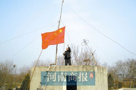 昨日8时许,在荥阳乔楼镇楚堂村75岁村民周同申家二层楼楼顶,一面鲜艳的五星红旗,沿着3根树干接成的旗杆冉冉升起。周同申迎着寒风站立在红旗下,几位邻居站在楼下,一同行着注目礼。