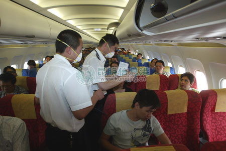 昨天下午,MU734航班刚刚在昆明国际机场停稳,云南出入境检验检疫局机场办事处的工作人员迅速准备好设备,戴上口罩、背着便携式测温仪和健康申明卡迅速登机,为来昆的旅客进行机上第1次测体温。
