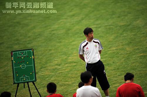 6月19日,国足主教练高洪波为队员讲解战术。当日,国足与中超江苏舜天队在昆明市新亚洲体育中心进行了一场教学热身赛,国家队以4比1战胜江苏队。新华社记者秦晴摄