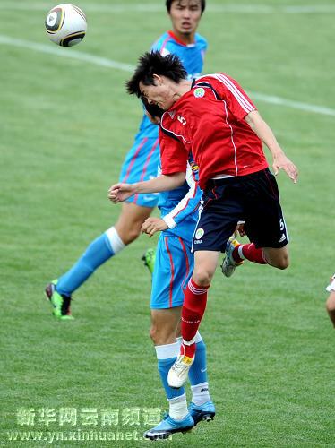 6月19日,国家队球员李学鹏(前)争抢头球。当日,国足与中超江苏舜天队在昆明市新亚洲体育中心进行了一场教学热身赛,国家队以4比1战胜江苏队。新华社记者秦晴摄