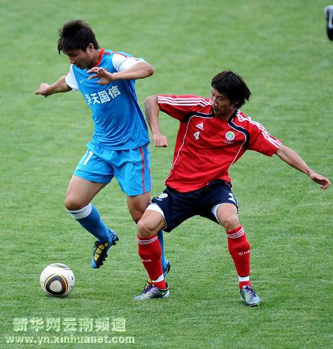 6月19日,国足队员荣昊(右)和江苏队员拼抢。当日,国足与中超江苏舜天队在昆明市新亚洲体育中心进行了一场教学热身赛,国家队以4比1战胜江苏队。新华社记者秦晴摄