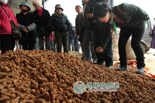 1月8日,在文山临时性三七交易市场内,大约有三四百人在市场内交易,但基本找不到种三七的农户来交易。这些人都是来自全国做三七买卖的,行业内称三七流动商(户)。这一天上午9点半至中午12点,市场内交易的量很小,大约只有几千公斤,原因是这天不是交易日。要等到星期天,更多的三七种植户才来到市场,这样也就不是流通商的独角戏了。