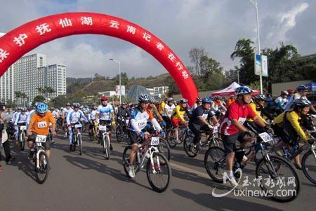 “保护抚仙湖 云南记者在行动”,在新中国第12个记者节来临之际,11月5日上午,2011年聂耳杯自行车环抚仙湖邀请赛在澄江县开赛。来自中央驻云南新闻单位、省内20余家新闻单位组成的23支代表队300余名运动员、教练员以及裁判员参加了此次赛事。