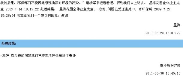 日照市民 2009年7月14日反应“富凯木业毒气污染熏死人”的问题,7月27日回复说正在查处中;2011年5月24日的同一问题,2011年6月30日日照市环保局的回复是:您反映的问题我们已交东港环保局进行查处。然而,历时近三年,这一问题还是没有任何解决的措施,参见日照市政府回应网民投诉问题的网页截图: