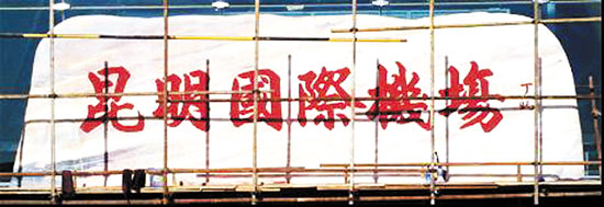 “这是在挑战我呀,哈哈!我一口答应了下来,就取来斗笔和一桶紫土(化工原料)直接往石头上写,‘昆明国际机场’六个一米高的字,我六分钟就搞定了。”回忆起当时的场景,丁炳很激动。